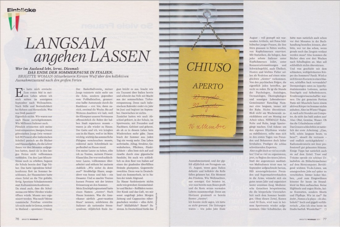 Mein Erschöpfungszustand hatte einen Namen: „rientro„. Nach Hause kommen. Was die Amerikaner zärtlich „post-vacation blues“ nennen, zelebrieren die Italiener als nationales Stresssyndrom. Alljährlich Ende August bricht es aus, kracht wie ein Tsunami über Italien herein und schreckt das Volk mit Macht aus der sommerlichen Tiefenentspannung. Denn nach italienischem Kalender endet ein Jahr im Juni und beginnt im September. Dazwischen ist nichts. Zunächst hatten wir noch Abschied gefeiert, in der Schule, im Sportverein, mit Freunden und Nachbarn. Geküsst und geherzt, als ob es in diesem Leben kein Wiedersehen mehr gäbe. Dann brach der Sommer aus. Jeden Tag ein wenig mehr. Das Leben zerbröselte. Alltag, Struktur, Gewohnheiten, Pflichten, Pünktlichkeit – alles löste sich auf und rieselte durch eine gigantische Sanduhr, bis auch wir schließlich zu dem Rest von Italien auf einen der gnadenlos überfüllten Strände plumpsten. Gegenwehr zwecklos. Denn was in Deutsch- land ein Sommerloch, ist in Italien der totale Abgrund.